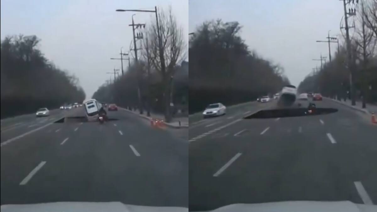 En el impactante video que fue publicado en redes sociales se observa el momento en que la camioneta logra salvarse de caer al enorme cráter; sin embargo, el motociclista no contó con la misma suerte, y cayó de manera súbita a la profundidad.