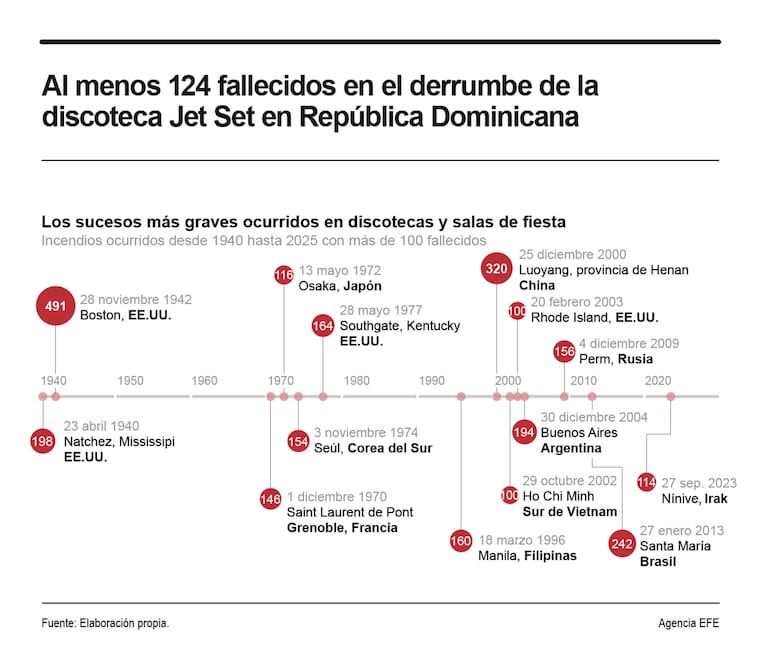 El derrumbe del techo de la Jet Set discoteca de Santo Domingo, en la República Dominicana, ocurrido este martes, con al menos 218 muertos y más de cien heridos, es el suceso más grave registrado en discotecas y salas de fiesta del mundo, desde 2013.
