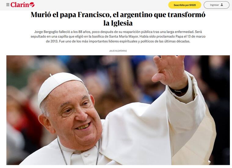 Clarín, uno de los medios más importantes de Argentina, país natal de Francisco, destacó en su titular que el papa “transformó la Iglesia”.