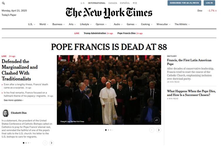 The New York Times, uno de los periódicos más prestigiosos del mundo, con sede en la ciudad conocida como ‘La Gran Manzana’ de Estados Unidos, tiene como noticia principal en su página web la muerte del papa.