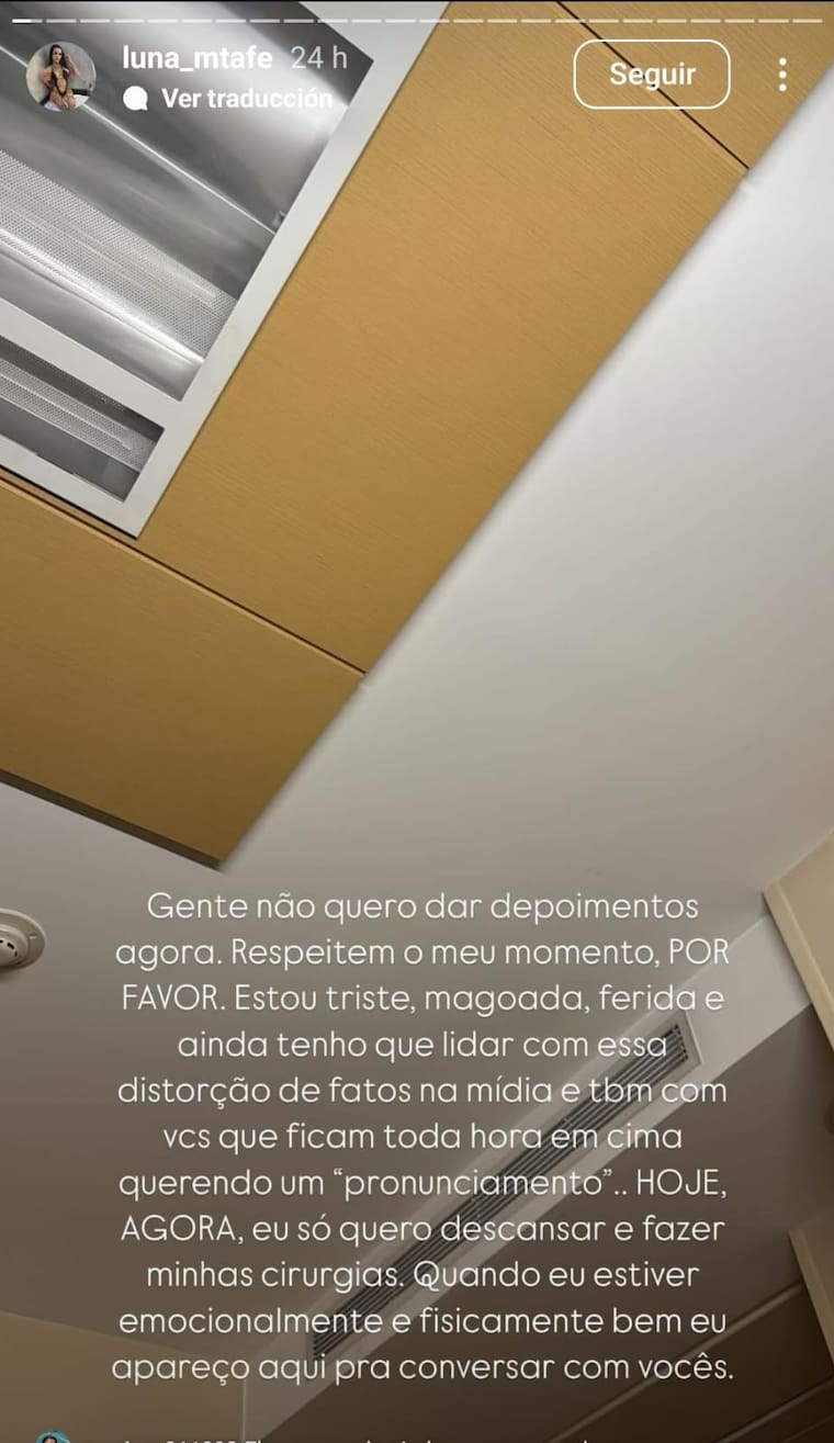 “Gente, no quiero dar declaraciones ahora. Respeten mi momento, por favor. Estoy triste, dolida, herida y todavía tengo que lidiar con esta distorsión de los hechos en los medios y con ustedes, que están encima todo el tiempo queriendo un ‘pronunciamiento’. HOY, AHORA, solo quiero descansar y hacerme mis cirugías. Cuando esté bien emocional y físicamente, apareceré aquí para hablar con ustedes”, se lee en un mensaje que publicó Luna luego se ser intervenida.