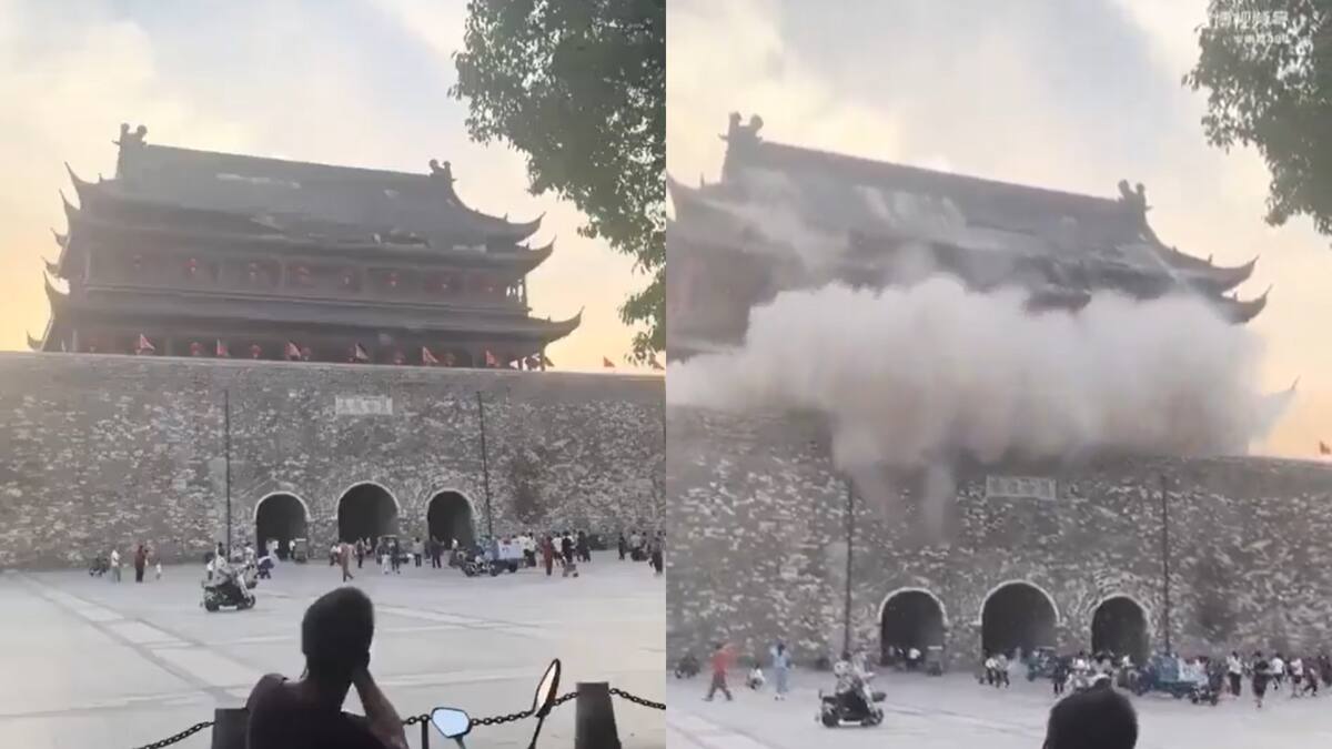 Momentos de pánico vivieron turistas y ciudadanos que se encontraban cerca de la Torre del Tambor, monumento ubicado en la localidad de Fengyang, China, luego de que se derrumbara parte de esta antigüedad de más de 650 años.