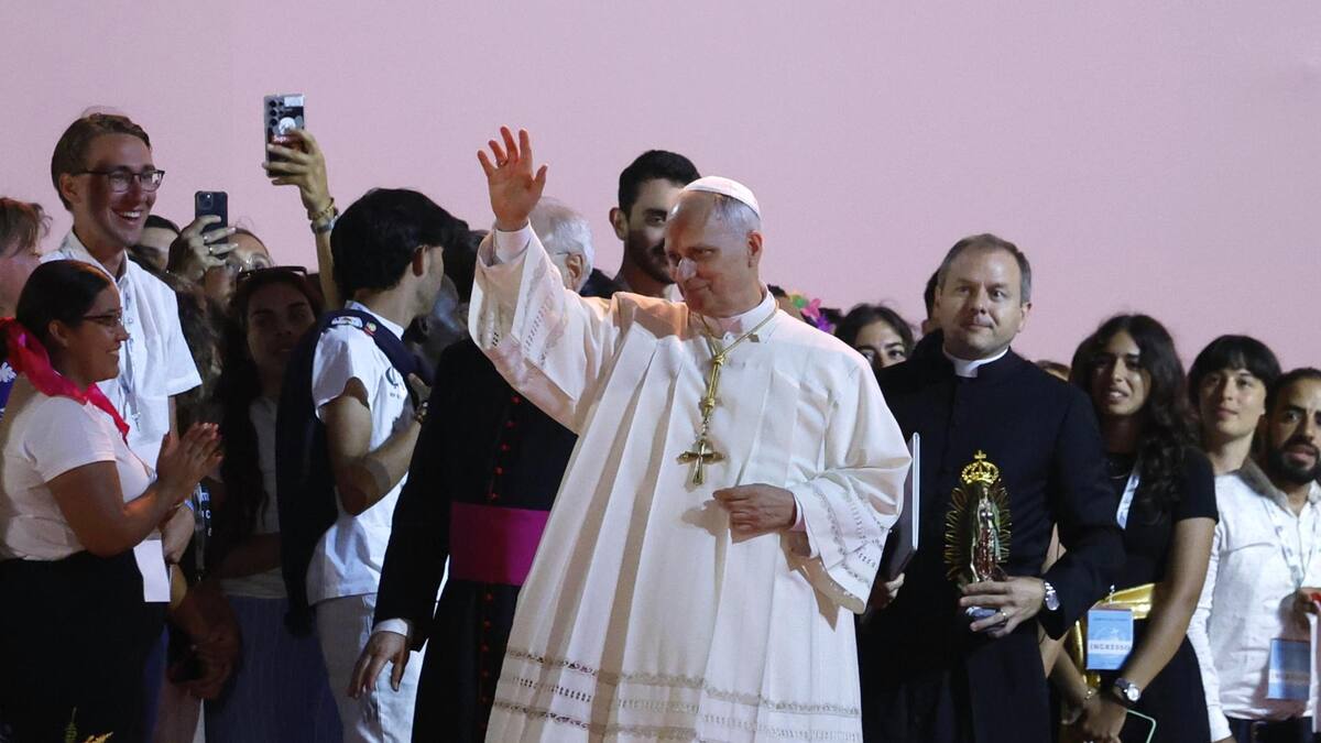 León XIV llegó en helicóptero y después recorrió todo el lugar a bordo del papamóvil, saludando y bendiciendo a los muchos jóvenes que le esperaban con emoción, algunos de ellos llegando incluso a acompañar corriendo a la comitiva pontificia.