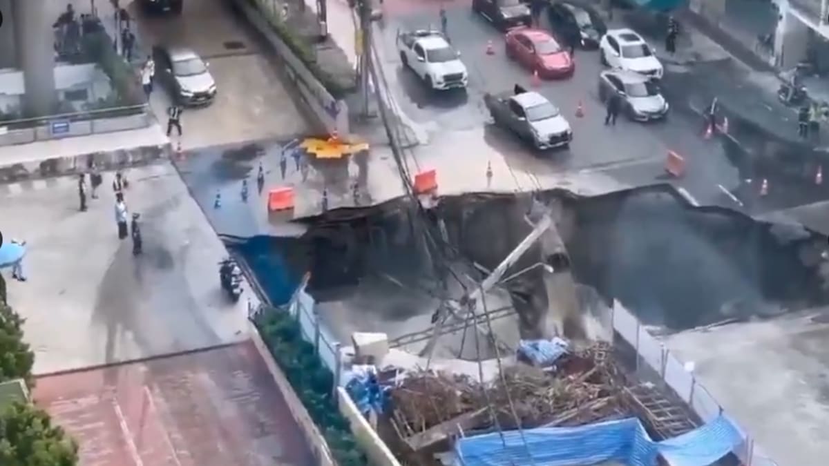 Cuando el terreno se abrió, según muestran varios vídeos compartidos en las redes sociales, postes con tendido eléctrico cayeron dentro del foso, en el que dos gigantes tuberías vertieron agua, lo que ayudó a que se ampliara el socavón.