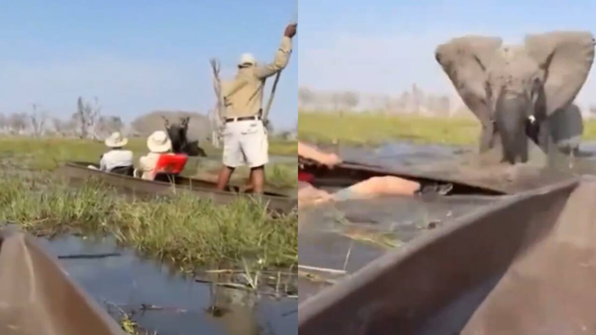 El incidente se registró el pasado sábado 27 de septiembre. En las imágenes se aprecia a los guías locales conduciendo las canoas conocidas como makoro. Ser acercaron demasiado a una elefante con sus crías, lo que causó que un macho de la manada irrumpiera e intentara atacar a los visitantes.