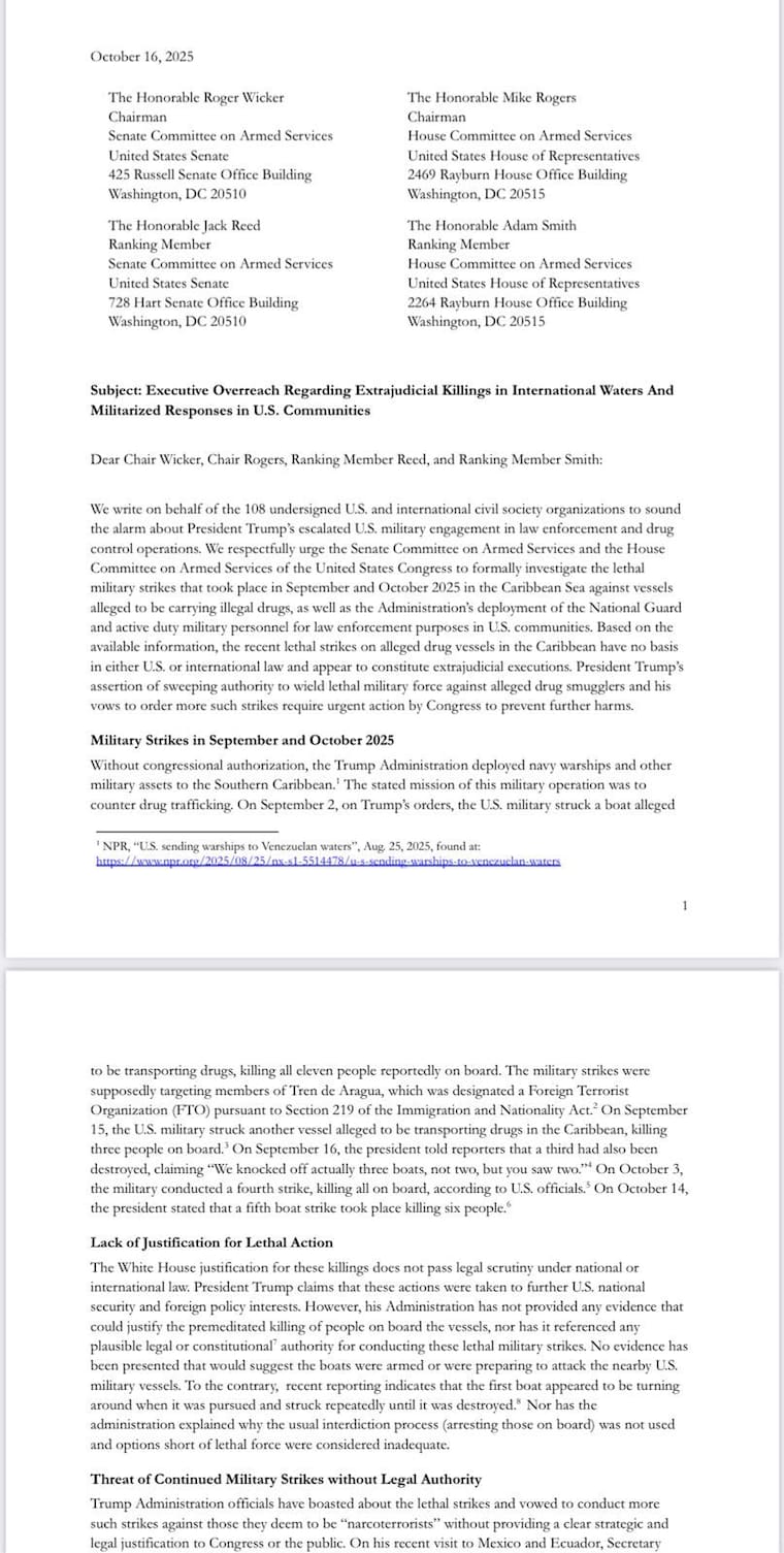 Un total de 108 organizaciones civiles estadounidenses e internacionales enviaron este 16 de octubre una carta al Congreso de Estados Unidos para exigir una investigación formal sobre los ataques militares letales realizados por la Administración Trump en el sur del Caribe durante septiembre y octubre de este año, los cuales, según denuncian, habrían sido ejecutados sin autorización legislativa y podrían constituir ejecuciones extrajudiciales.