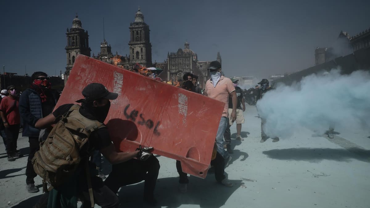 El recorrido inició en el Ángel de la Independencia como una marcha pacífica y terminó en la plaza más grande del país, donde el “bloque negro” de la manifestación golpeó con martillos y piedras las vallas que resguardaban el Palacio Nacional hasta derribarlas.