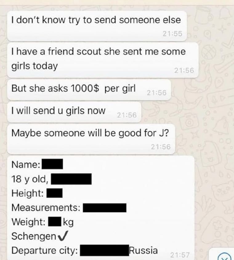 En la captura difundida por los demócratas se observa un intercambio en el que se habla sobre enviar mujeres para ‘J’. “No sé, intenta enviar a otra persona. Tengo una amiga que es reclutadora, me envió algunas chicas hoy. Pero pide 1.000 dólares por chica. Te enviaré chicas ahora. ¿Quizás alguna sea buena para J?”.