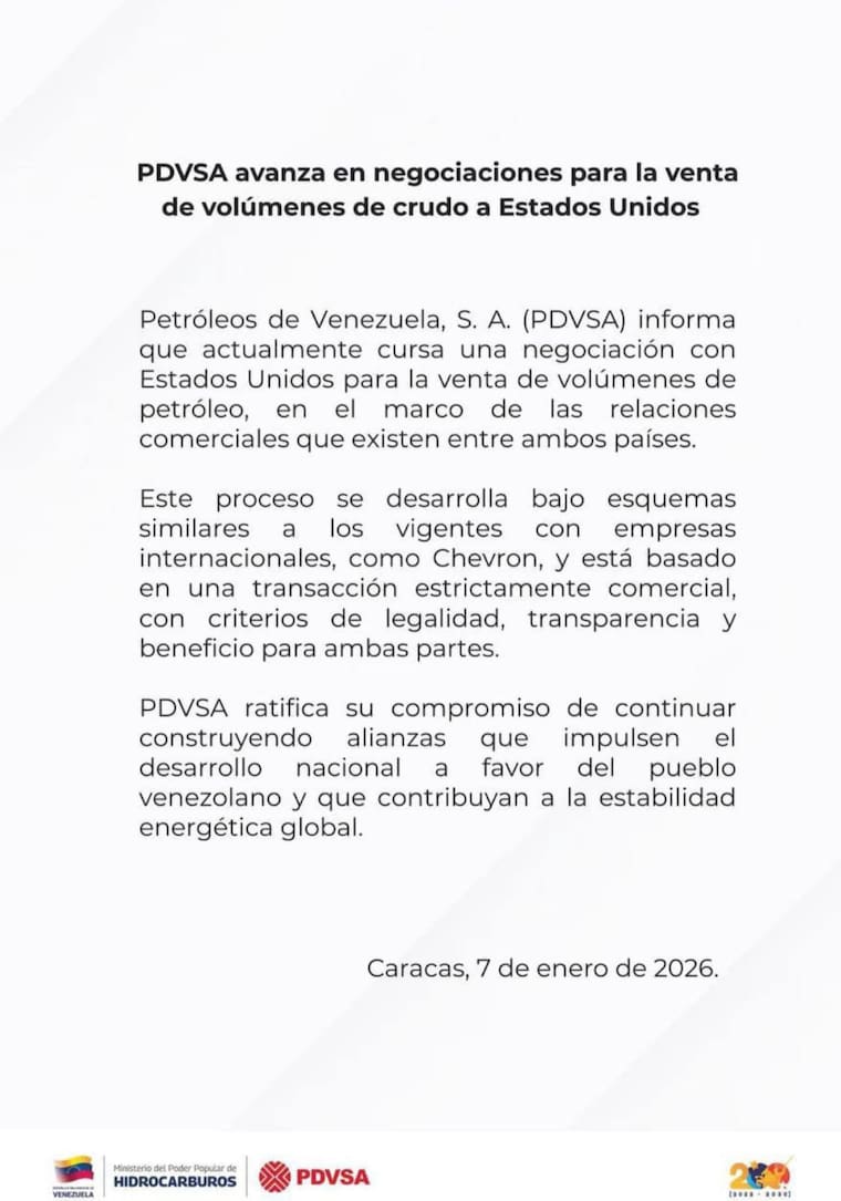 De acuerdo con PDVSA, el proceso de negociación con Estados Unidos se lleva a cabo bajo esquemas similares a los aplicados con empresas internacionales, entre ellas la petrolera estadounidense Chevron, con la que Venezuela mantiene acuerdos energéticos en curso.