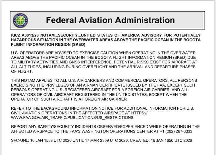 La Administración Federal de Aviación de EE. UU. (FAA) emitió este viernes dos avisos advirtiendo a operadores aéreos estadounidenses de una “situación potencialmente peligrosa” en espacios aéreos sobre el Pacífico colombiano y centroamericano “debido a actividades militares” y a posibles interferencias en los sistemas de navegación.