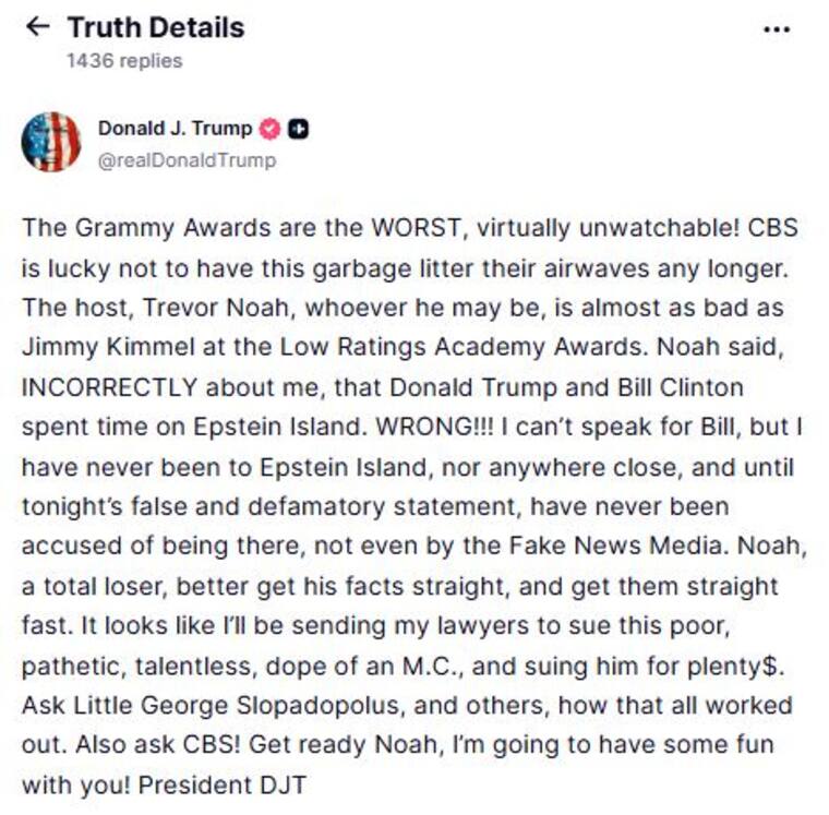 El presidente de EE. UU., Donald Trump, ha amenazado con demandar a Trevor Noah, presentador de los Grammy, por decir que estuvo en la isla de Jeffrey Epstein: “Parece que voy a enviar a mis abogados a demandar a este pobre, patético, sin talento y tonto presentador”, ha dicho en la red social Truth.