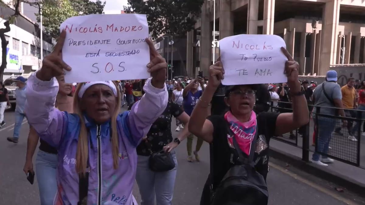 Con carteles que reclamaban la puesta en libertad de Maduro y su esposa Cilia Flores, ambos recluidos en una cárcel de Nueva York, los manifestantes marcharon por las inmediaciones de la sede diplomática junto a una persona ataviada con un traje carcelario y con una máscara del rostro de Trump, a quien simulaban golpear como protesta por el “secuestro” del líder chavista y la “agresión” contra el “pueblo hermano” de Venezuela.