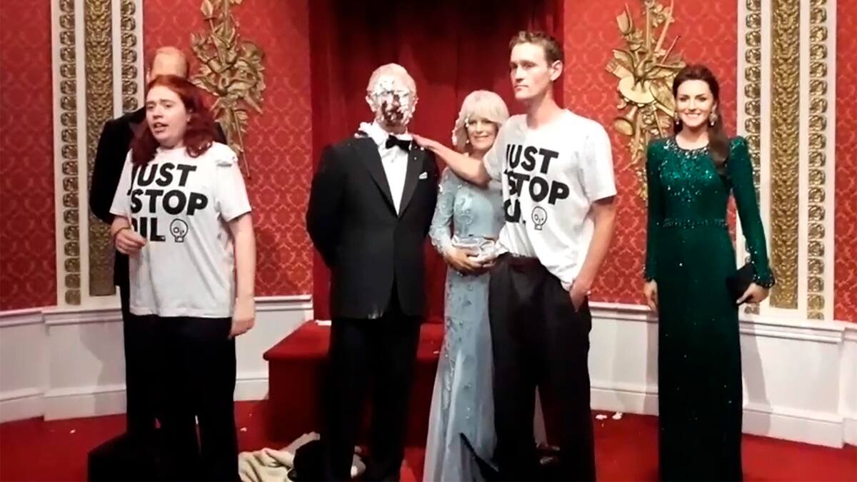 Dos activistas de Just Stop Oil estamparon este lunes 24 de octubre dos tortas de chocolate en el rostro de la figura de cera del rey Carlos III del Reino Unido en el museo de Madame Tussauds, en Londres, con la consigna de que el gobierno británico 'detenga las nuevas licencias de petróleo y gas'.
