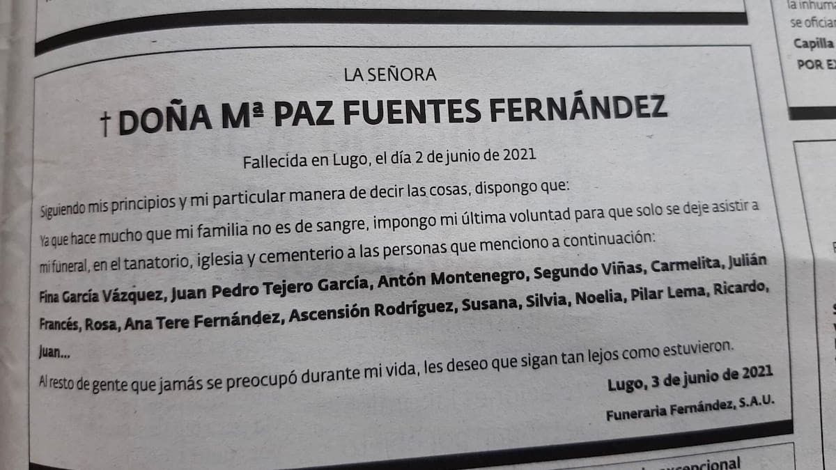 La mujer dejó por escrito quiénes serían las personas que asistirían a su funeral. Y dio a entender en su esquela que hace un tiempo no se llevaba bien con sus familiares.