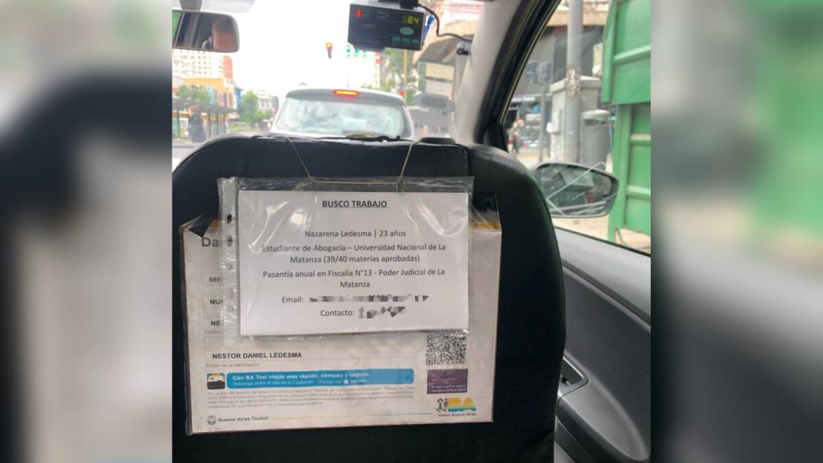 Con el propósito de que sus pasajeros vieran el currículum de su hija Nazarena Ledesma y así tener la oportunidad de conseguirle una vacante laboral, Néstor compartió los datos de la joven de 23 años en una hoja plastificada.