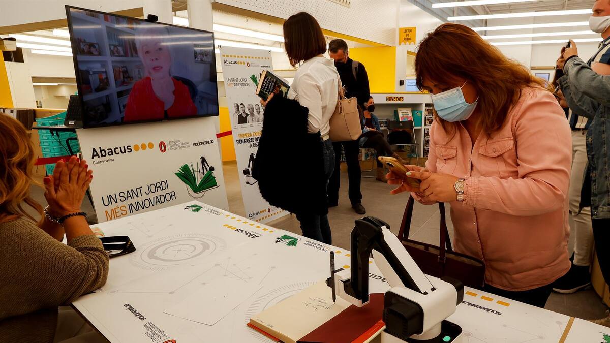 Así se imprime la dedicatoria durante un encuentro telemático como parte de una iniciativa de la empresa Abacus en San Jordi, España.