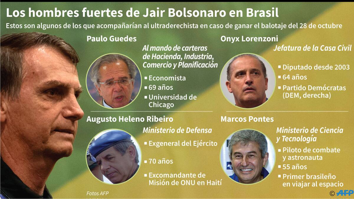Sin el apoyo de un partido fuerte, Bolsonaro se impuso en la primera vuelta con el 46% de los votos frente al 29% de Haddad y es ampliamente favorito para la segunda, con 59% de los apoyos frente a 41% para Haddad, según sondeos coincidentes de Ibope y Datafolha.