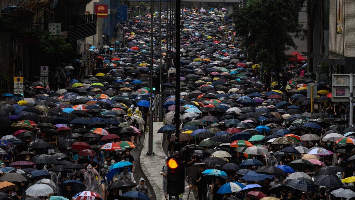 Centenares de manifestantes prodemocracia se congregaron este domingo bajo la lluvia en un estadio y empezaron a marchar por las calles de Hong Kong, un día después de que ocurrieron violentos enfrentamientos en esta excolonia británica.