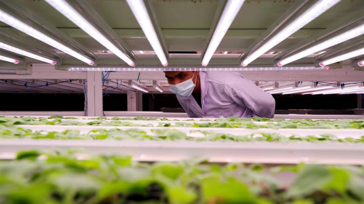 Un investigador tailandés examina hojas de tabaco para producir un prototipo de una vacuna contra la ovid-19 en un laboratorio de Baiya Phytopharm.
