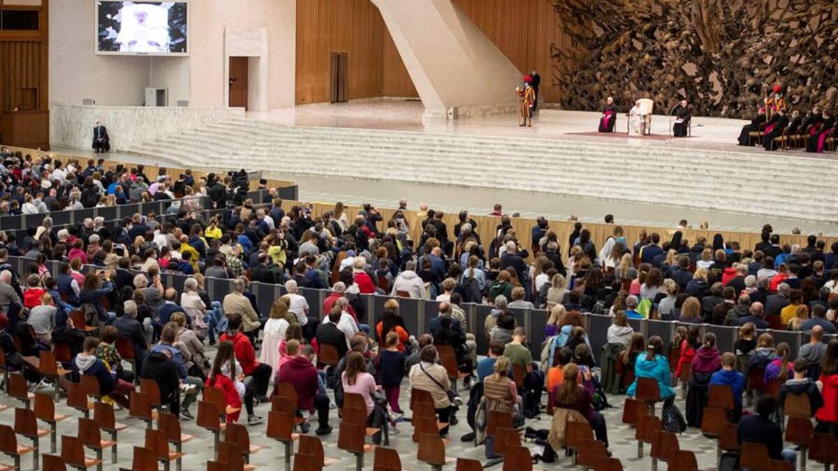 'Como hago normalmente yo querría bajar y acercarme a vosotros para saludaros pero con las nuevas prescripciones es mejor mantener las distancias y a los enfermos los saludo de corazón desde aquí', dijo el pontífice desde su trono en el aula Pablo VI del Vaticano.