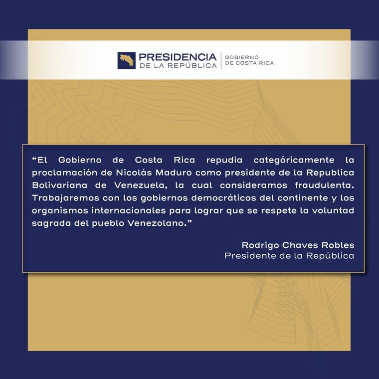 En este mismo sentido, el mandatario de los costarricenses, Rodrigo Chaves Robles, a través de un comunicado oficial afirmó: “El Gobierno de Costa Rica repudia categóricamente la proclamación de Nicolás Maduro como presidente de la República Bolivariana de Venezuela, la cual consideramos fraudulenta”.