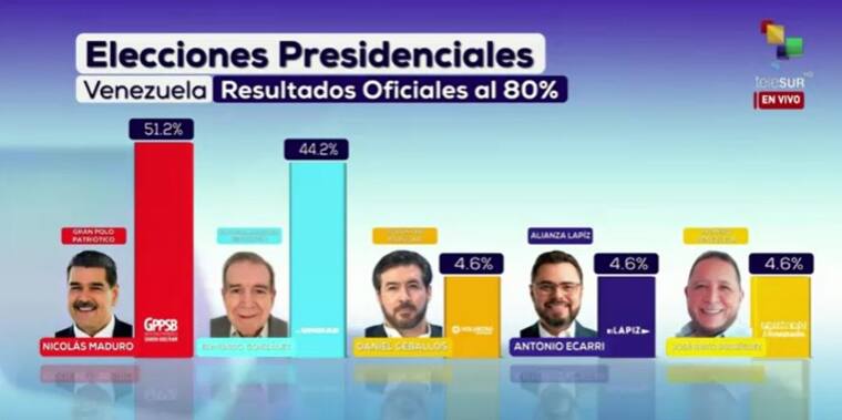 Según el primer reporte, el abanderado de la oposición mayoritaria, Edmundo González Urrutia, obtuvo 4.445.978 votos, los que supone el 44,2 % de los sufragios.