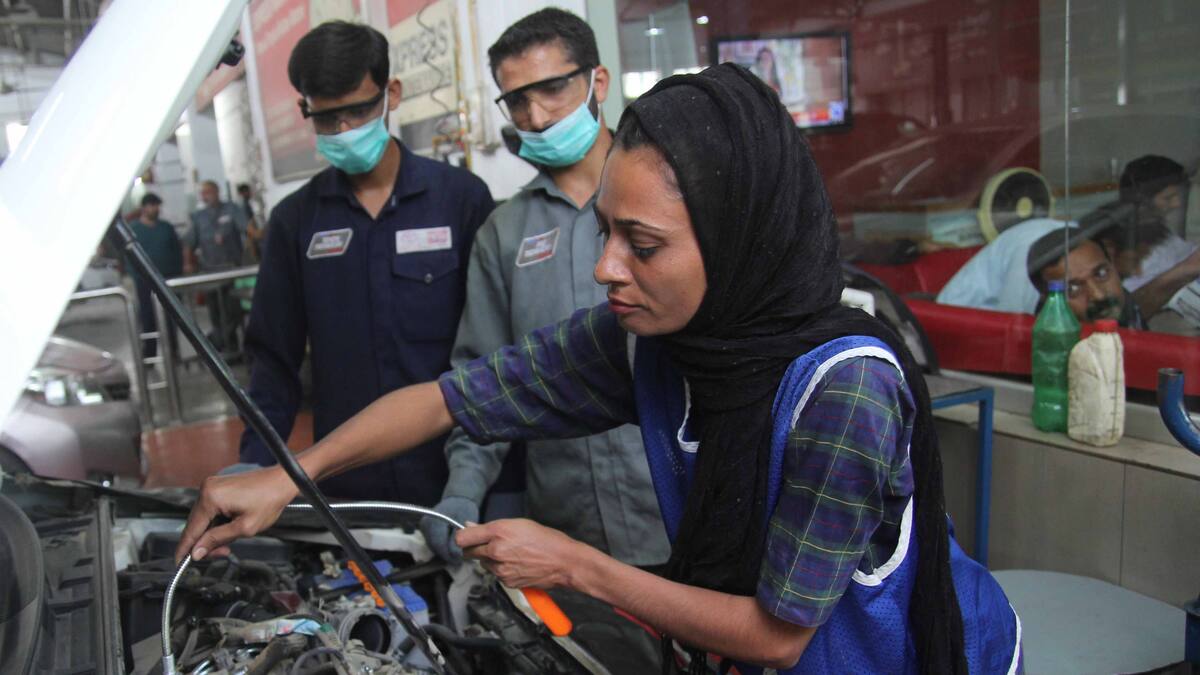 Ella ha desarrollado sus talentos durante un año en un concesionario de una marca japonesa en Multan, donde es la única mujer entre los mecánicos. Atornilla, desenrosca, monta, desmonta, purga... Siempre muy concentrada, para el asombro de algunos clientes.