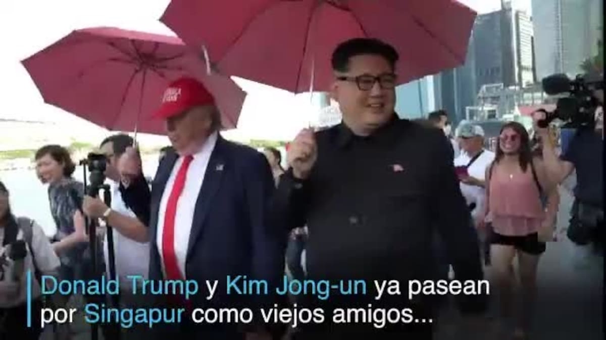 Dos imitadores de los líderes mundiales se pasean por Singapur tomándose fotos con los visitantes y posando ante los lentes que quieren registrar el ‘apretón de manos’ de los mandatarios de Estados Unidos y Corea del Norte.