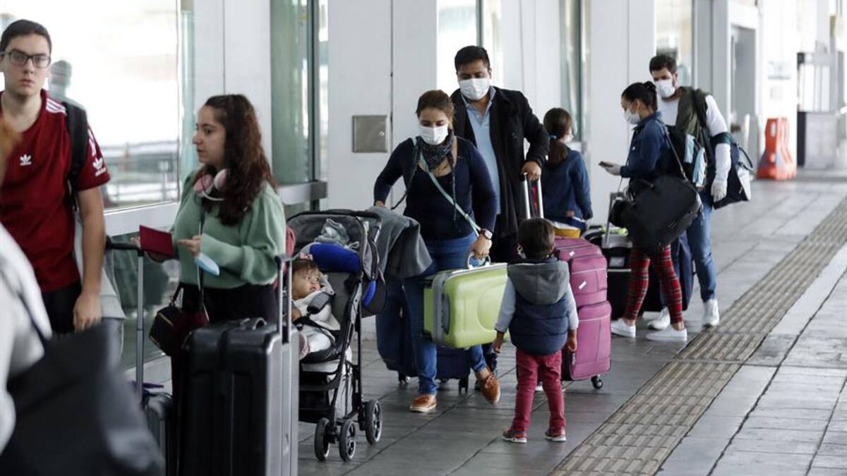 El grupo está formado en su mayoría por adultos, algunos empujando cochecitos con niños, todos con mascarillas y muchos con guantes, en un aeropuerto vacío en el que guardaban rigurosamente metros de distancia entre unos y otros para evitar el contagio.