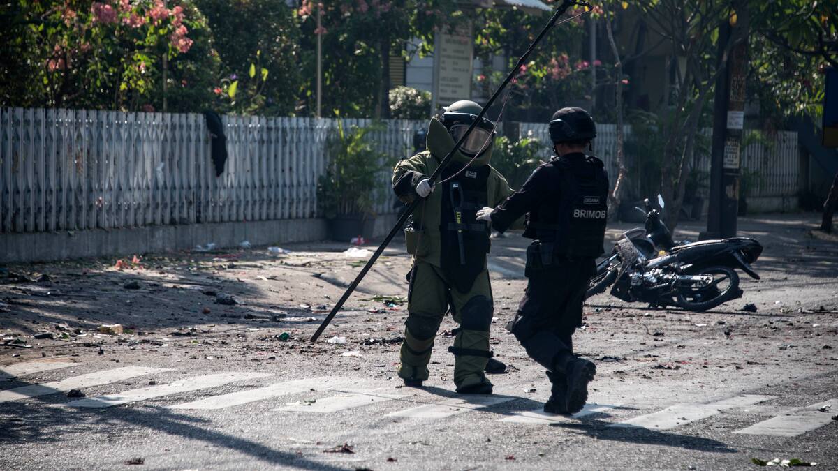 Los medios de comunicación difundieron imágenes en las que se veía un cuerpo yaciendo delante de una de las puertas de la iglesia católica de Santa María, en Surabaya, y agentes de la policía examinando el lugar, lleno de escombros.