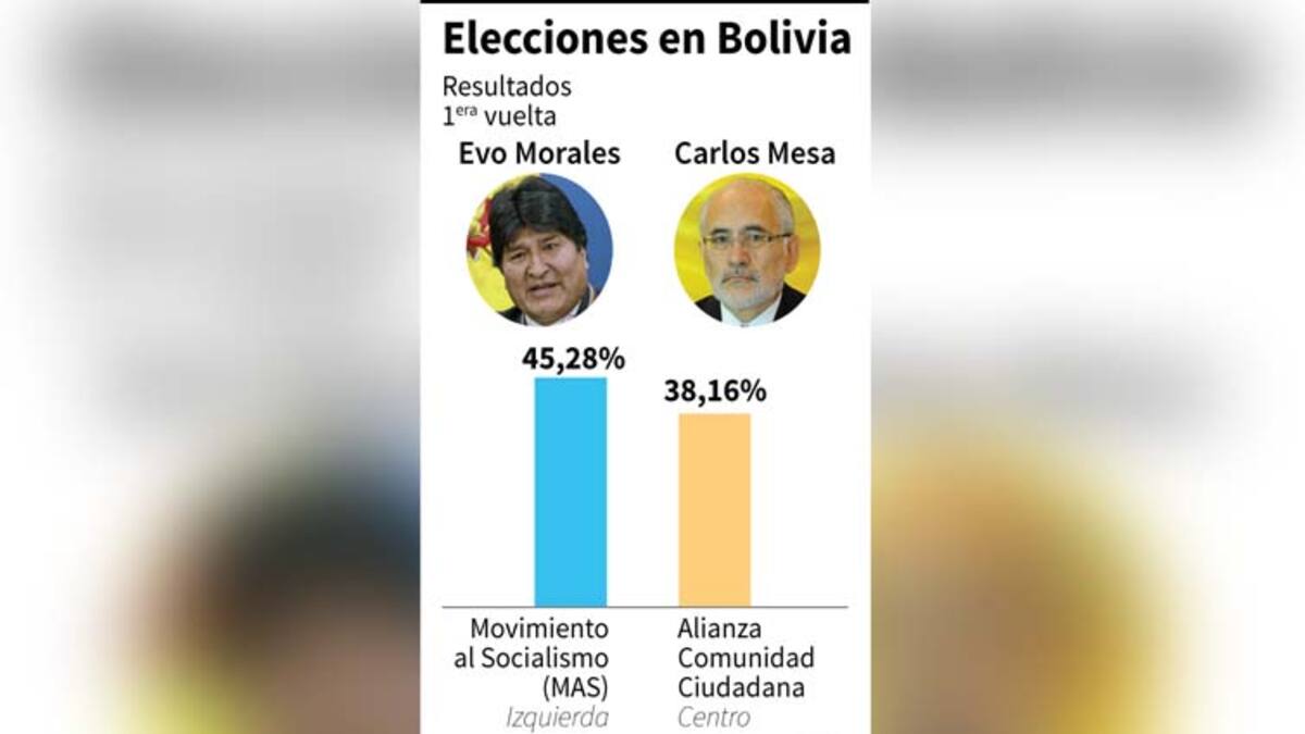 Según los primeros resultados oficiales, se vislumbra una segunda vuelta entre Morales, que busca un cuarto mandato, y Mesa, prevista para el próximo 15 de diciembre.
