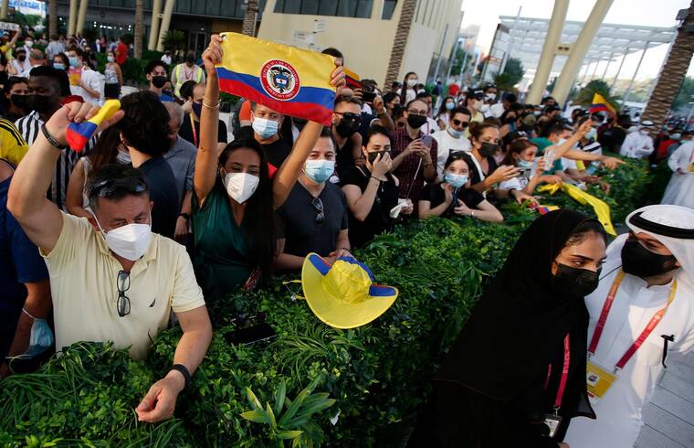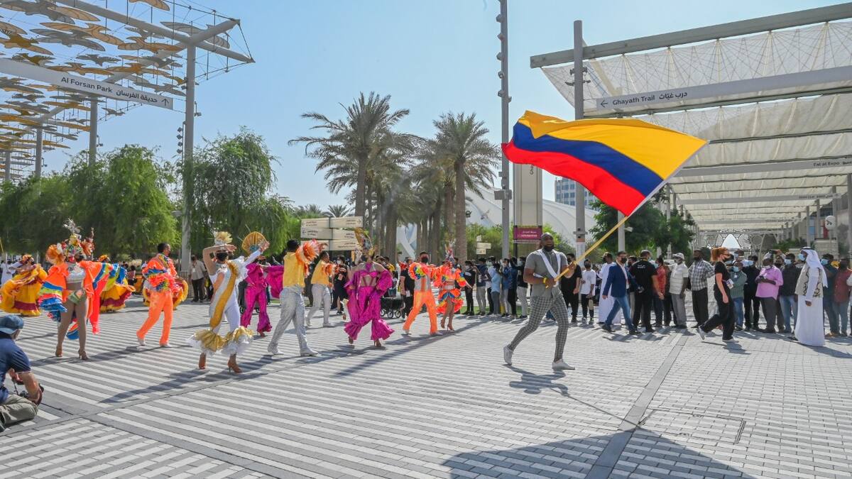 Una multitud disfrutó del desfile y visitó el pabellón de Colombia en su día nacional durante el evento realizado en Emiratos Árabes Unidos.