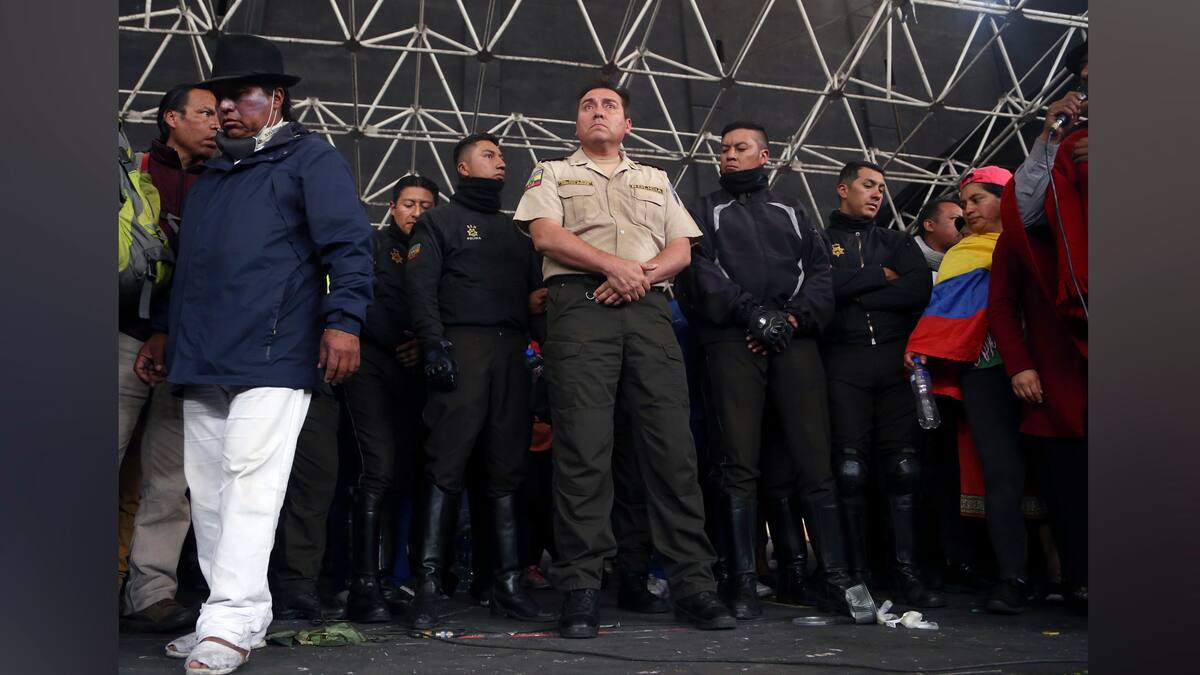 Los uniformados, entre ellos una mujer, fueron mostrados por los manifestantes sobre la tribuna del ágora de la Casa de la Cultura, en Quito, donde los indígenas están concentrados tras protagonizar una gran movilización el miércoles por las calles de la capital.