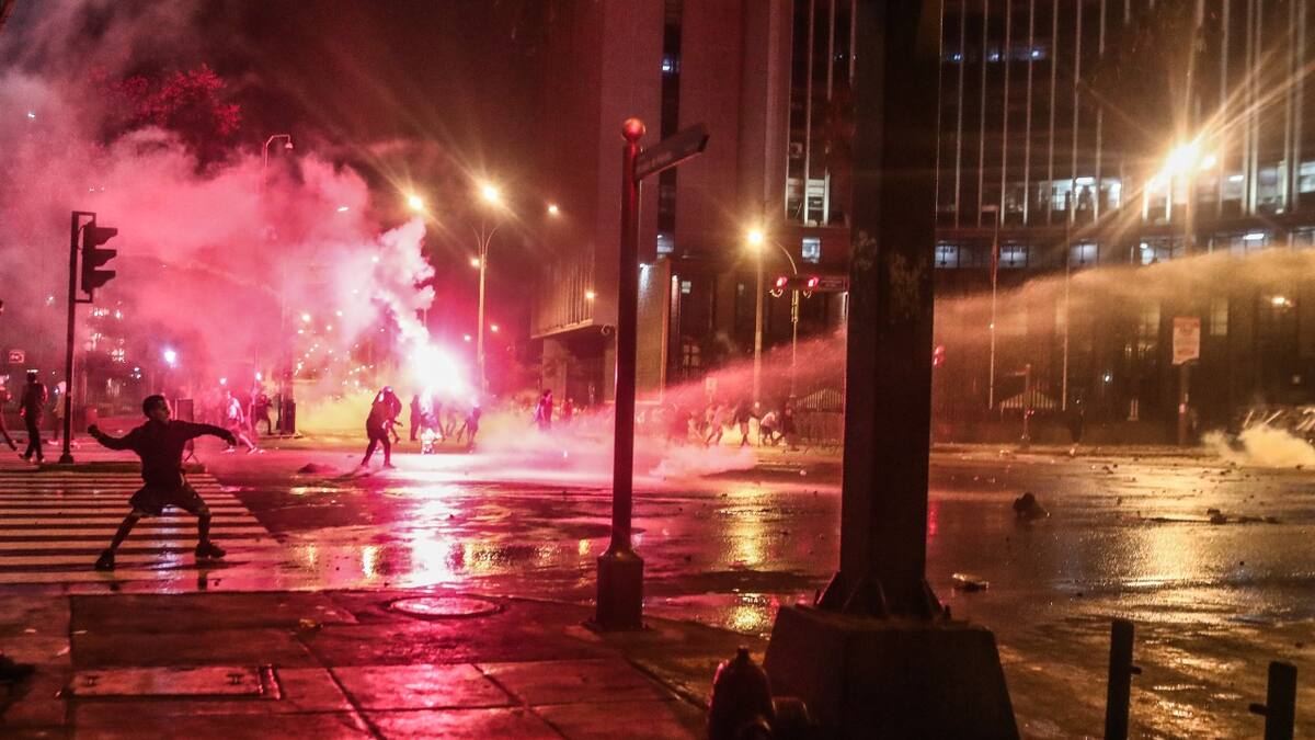 En Lima no se habían producido altercados relacionados con el paro de transportes, pero bastó la declaración del estado de emergencia y el toque de queda para que, a unos metros del Palacio Legislativo, la avenida Abancay se convirtiera en un campo de batalla entre manifestantes y agentes, donde bombas de gas lacrimógeno se cruzaban en el aire con piedras y botellas.