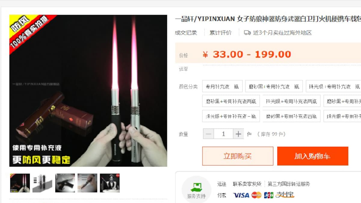 El precio de esta 'arma' varía entre los 130 y 200 yuanes (entre 58.302 y 89.696 pesos colombianos), dependiendo del número de botellitas de gas que se adquieran para recargarlo. Cada botellita de gas llena puede durar entre 10 y 30 segundos lanzando llama y es resistible al viento.