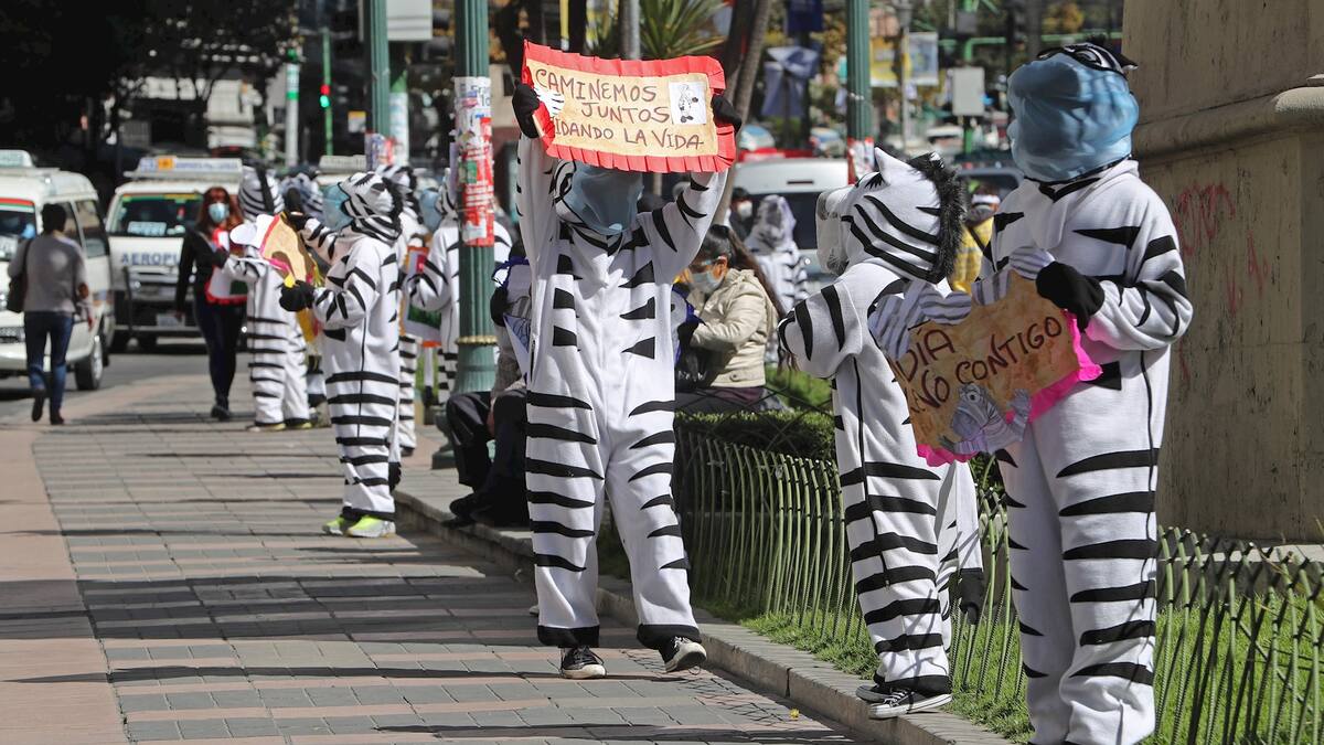 Las 'cebras' bolivianas, las queridas educadoras viales, volvieron a las calles de La Paz saltando, bailando y mostrando mensajes de apoyo emocional para reencontrarse con los paceños y transmitirles energía positiva en los 'consultorios de paz' para superar los difíciles tiempos que deja la pandemia.