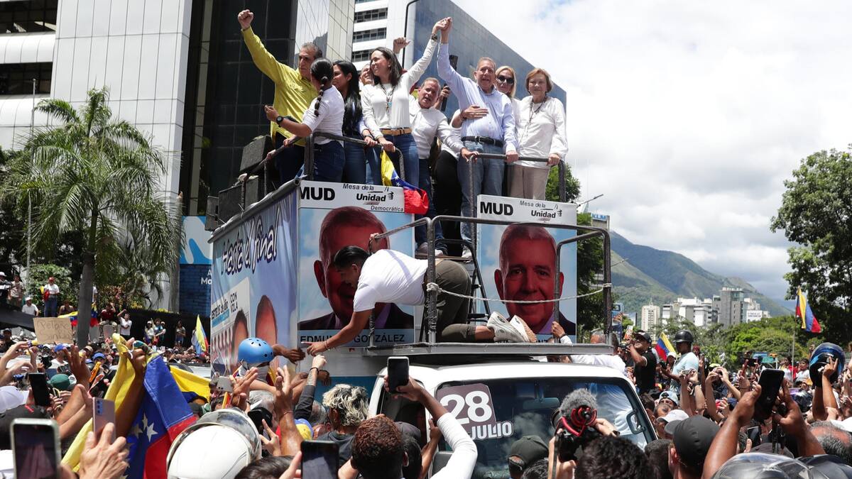 Machado y González Urrutia llegaron al lugar a bordo de un camión, desde el que recorrieron unos kilómetros en caravana, y ofrecieron un discurso en el que reiteraron que la 'lucha' que promueven es pacífica y busca que las autoridades reconozcan que el chavismo, en el poder desde 1999, perdió los comicios.