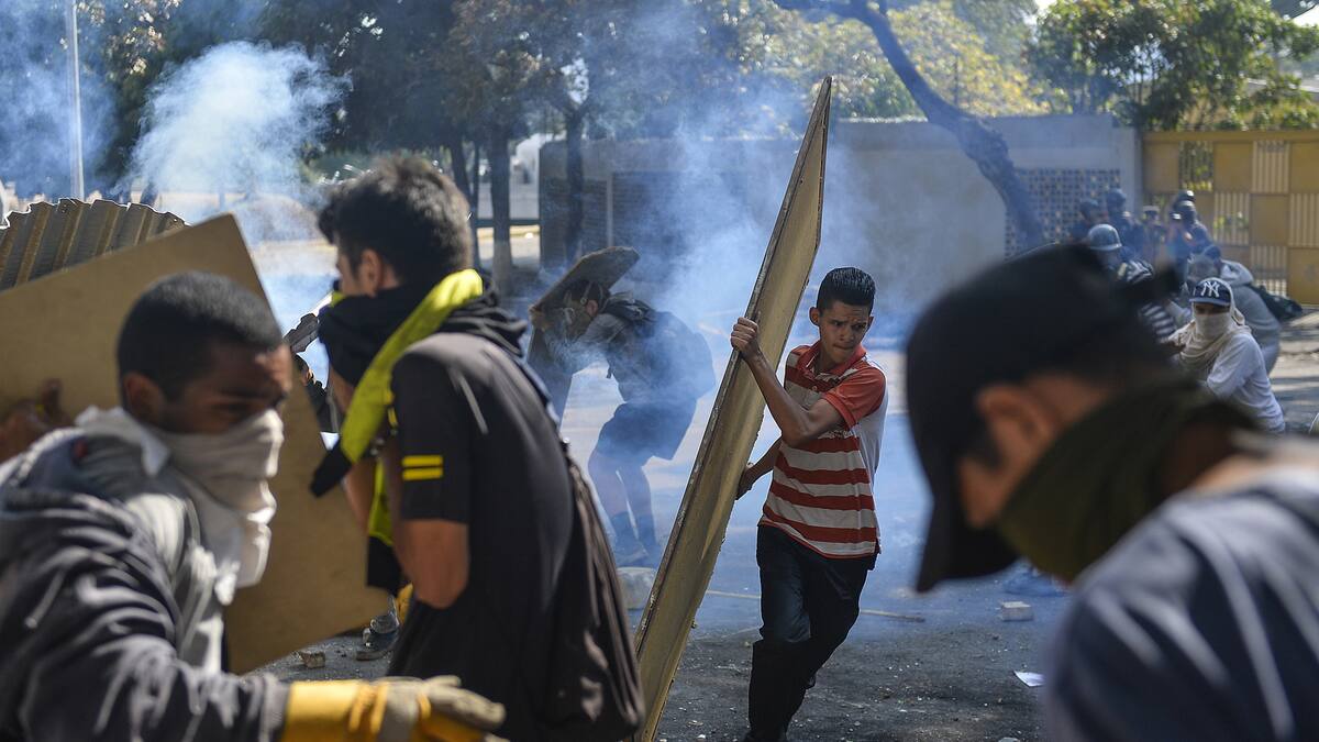 Tras varias horas de choques entre militares y opositores, que intercambiaron bombas lacrimógenas, piedras y cócteles molotov, una treintena de personas consiguió pasar el vehículo por un boquete abierto en la reja y le prendió fuego.