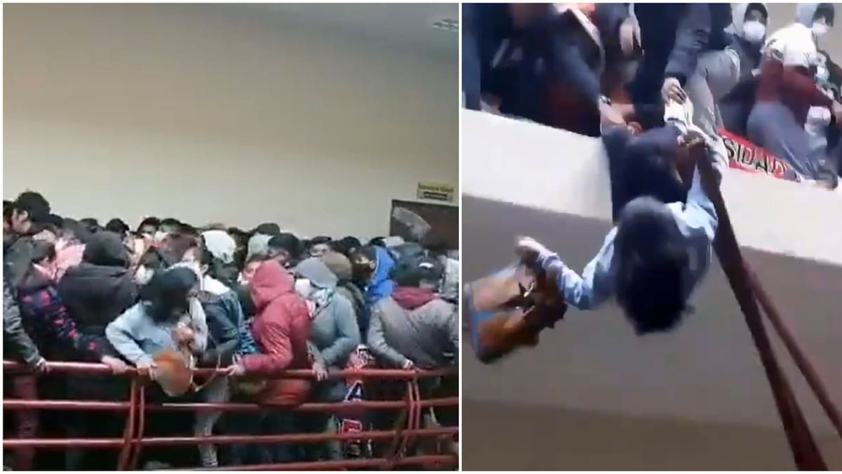 En varios videos que circulan por las redes sociales se ve a los estudiantes amontonados protestando en los corredores que dan a un salón, donde se realizaba la asamblea, momentos antes de que una de las barandas cediera y los ocho jóvenes cayeran desde el cuarto piso.