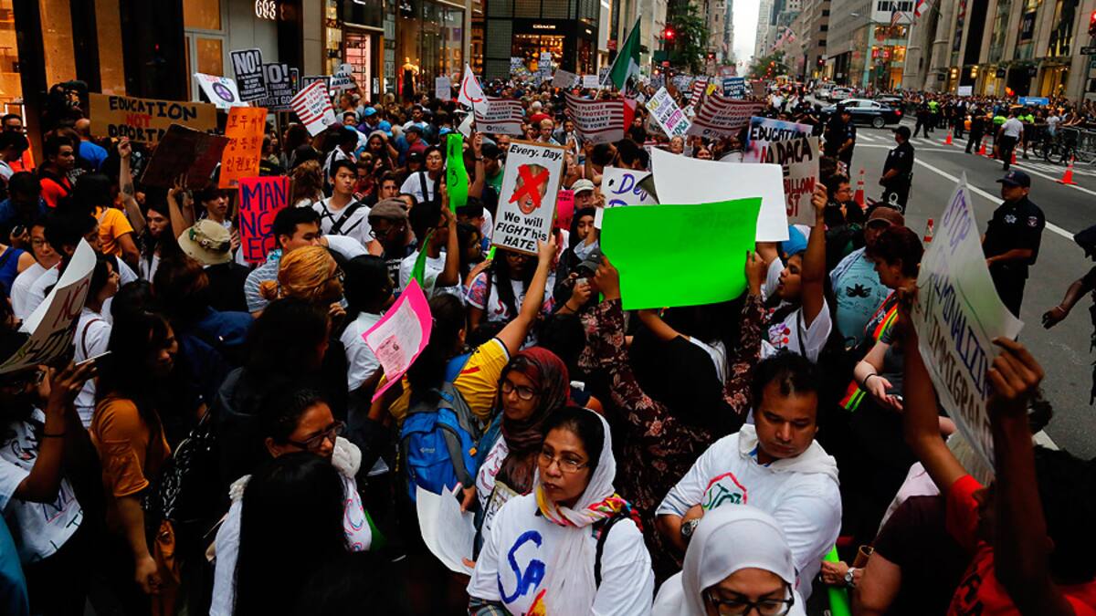 'Estamos para quedarnos, estamos para luchar', exclamaron los manifestantes sobre la calzada de la 5ta Avenida, cercana a la Trump Tower adonde el presidente volvió por primera vez desde su llegada a la Casa Blanca en enero pasado.