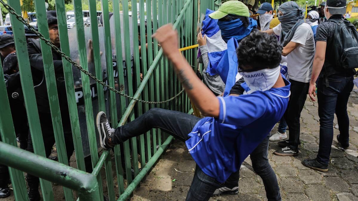 '¡A la iglesia se respeta!', gritaron los estudiantes durante una protesta en los predios de la privada Universidad Centroamericana (UCA), en Managua, cuya salida por el portón principal -una extensa cerca de reja de hierro- fue bloqueada por fuerzas antimotines.