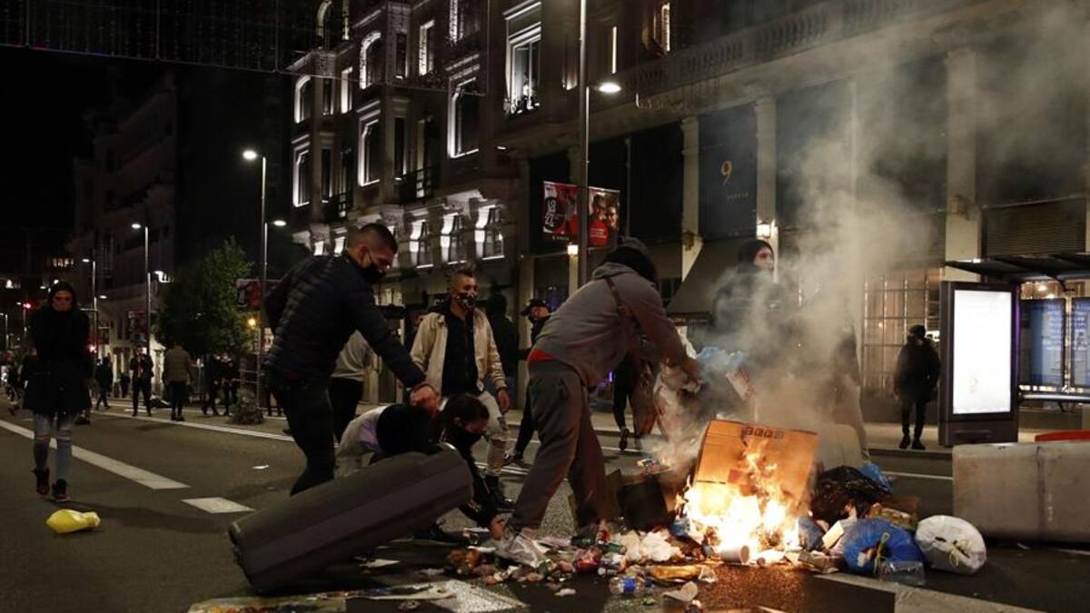 Las protesta más violenta fue la ocurrida en Madrid, donde se concentraron un centenar de personas bajo el lema 'Salimos a la calle, el pueblo está cansado'. La manifestación terminó con un grupo de diez personas instalando barricadas y quemando contenedores de basura para cortar la calle.