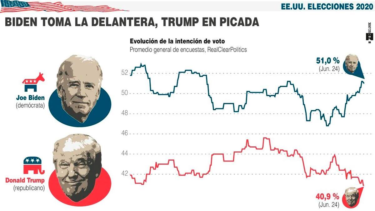 El sondeo, en el que participaron 1.640 adultos entre el 22 y el 24 de junio, mostró además que el gobernante estadounidense, que aspira a su reelección en los comicios de noviembre próximo, está por debajo de su rival y virtual candidato demócrata, el exvicepresidente Joe Biden, en la intención de voto.