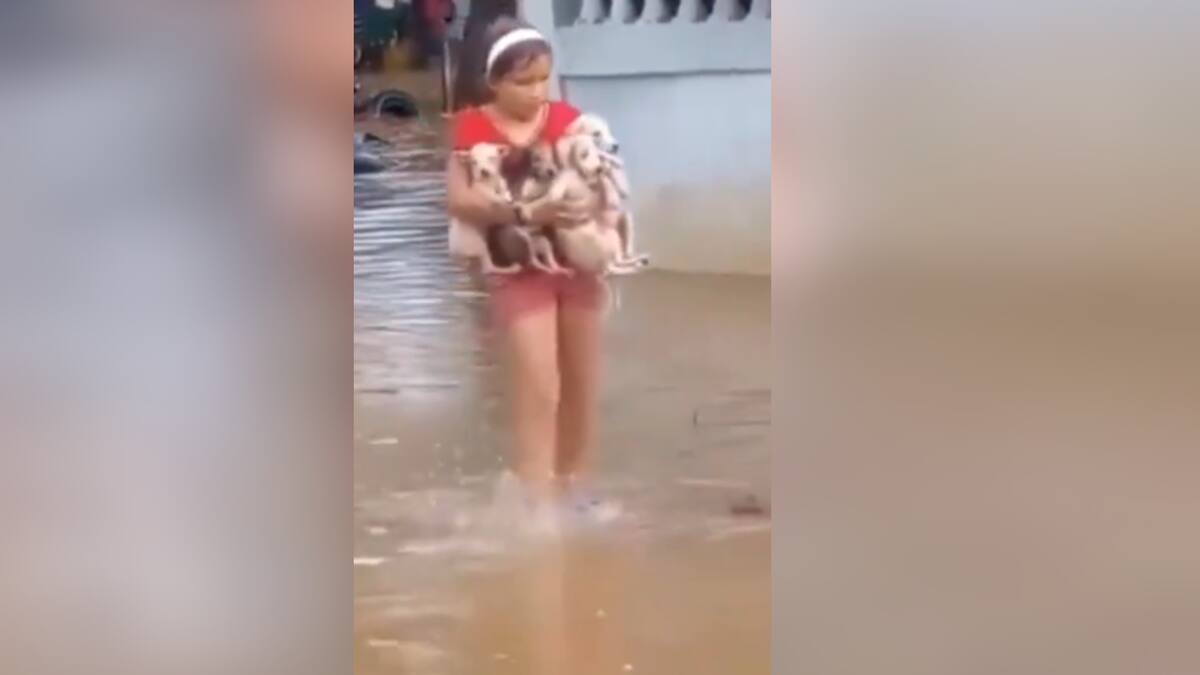 La escena de una niña con cuatro cachorros en sus brazos durante una inundación en Venezuela, se hizo viral en las redes sociales.