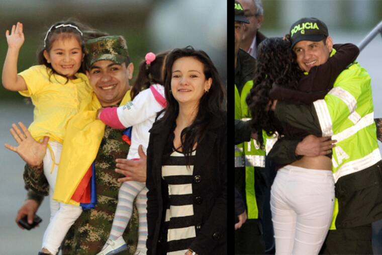Ambos uniformados llegaron vestidos de civil y fueron recibidos por altos mandos policiales y militares, luego de haber sido entregados por las Farc a la exsenadora Piedad Córdoba, el Comité Internacional de la Cruz Roja, Cicr, y la tripulación brasileña.