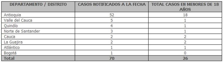 Antioquia aporta el mayor número de víctimas, con 52 casos, de los que 18 son menores. Por su parte, el departamento del Atlántico ha reportado un caso de un menor quemado y La Guajira dos, ambos menores de edad. Los datos entregados fueron relacionados así: