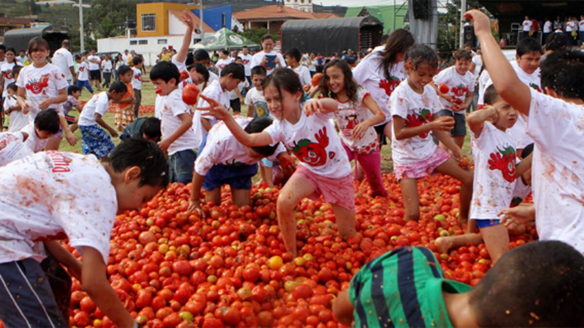 Miles de personas participaron ayer en la octava edición de la tomatina en Sutamarchán, en el centro del país, una fiesta que celebra la cosecha de este fruto. Habitantes de este pueblo del departamento de Boyacá, unos 170 kilómetros al norte de Bogotá, y centenares de visitantes, se congregaron en el estadio de fútbol de Sutamarchán para tomar parte en esta fiesta inspirada en la mundialmente conocida tomatina de Buñol (España).