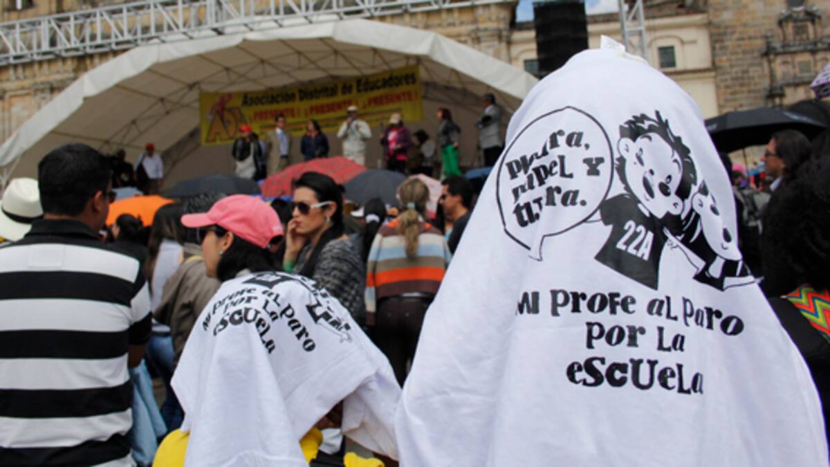 Ayer se cumplieron manifestaciones de miles de maestros en la Plaza de Bolívar, mientras se reunían en la sede de la Defensoría del Pueblo los representantes de Fecode y los ministros de Educación y Trabajo, Gina Parody y Luis Eduardo Garzón, con miras a conjurar el paro nacional de educadores que ya completa 15 días y que tiene a unos 9 millones de estudiantes sin clase.