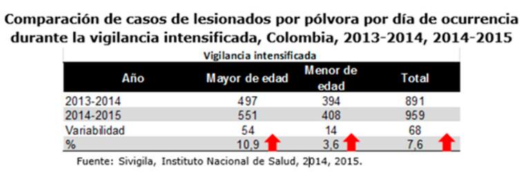 Durante las celebraciones correspondientes al lapso diciembre 2014 a enero 17 de 2015, el Instituto Nacional de Salud reportó un total de 403 niños, niñas y adolescentes lesionados con pólvora en todo el país. De este total, el ICBF constató 262 casos que generaron 99 amonestaciones para padres o cuidadores y se abrieron 163 procesos de restablecimiento derechos, 51 de los cuales terminaron con la interposición de una denuncia penal. Los casos restantes no pudieron ser constatados para la verificación de derechos, debido a la inconsistencia de la información suministrada por las familias a los centros hospitalarios.