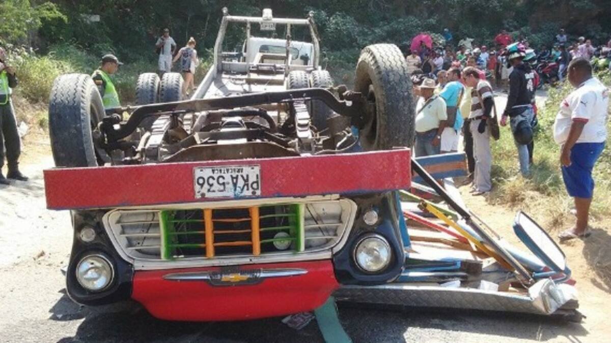 Personal de la Policía de Tránsito señaló que el automotor adecuado para el transporte de pasajeros de placas PKA-536, transitó en aparente normalidad por la carretera que conduce al balneario turístico, pero al estar en una de las últimas vueltas, el conductor no pudo controlarlo y terminaron accidentados. 'Todo fue muy rápido, vimos como la chiva bajaba sin control y de un momento a otro en una de las vueltas comenzó a voltearse y nosotros adentro. Fue muy aterrador', dijo César Canoles, uno de los afectados.